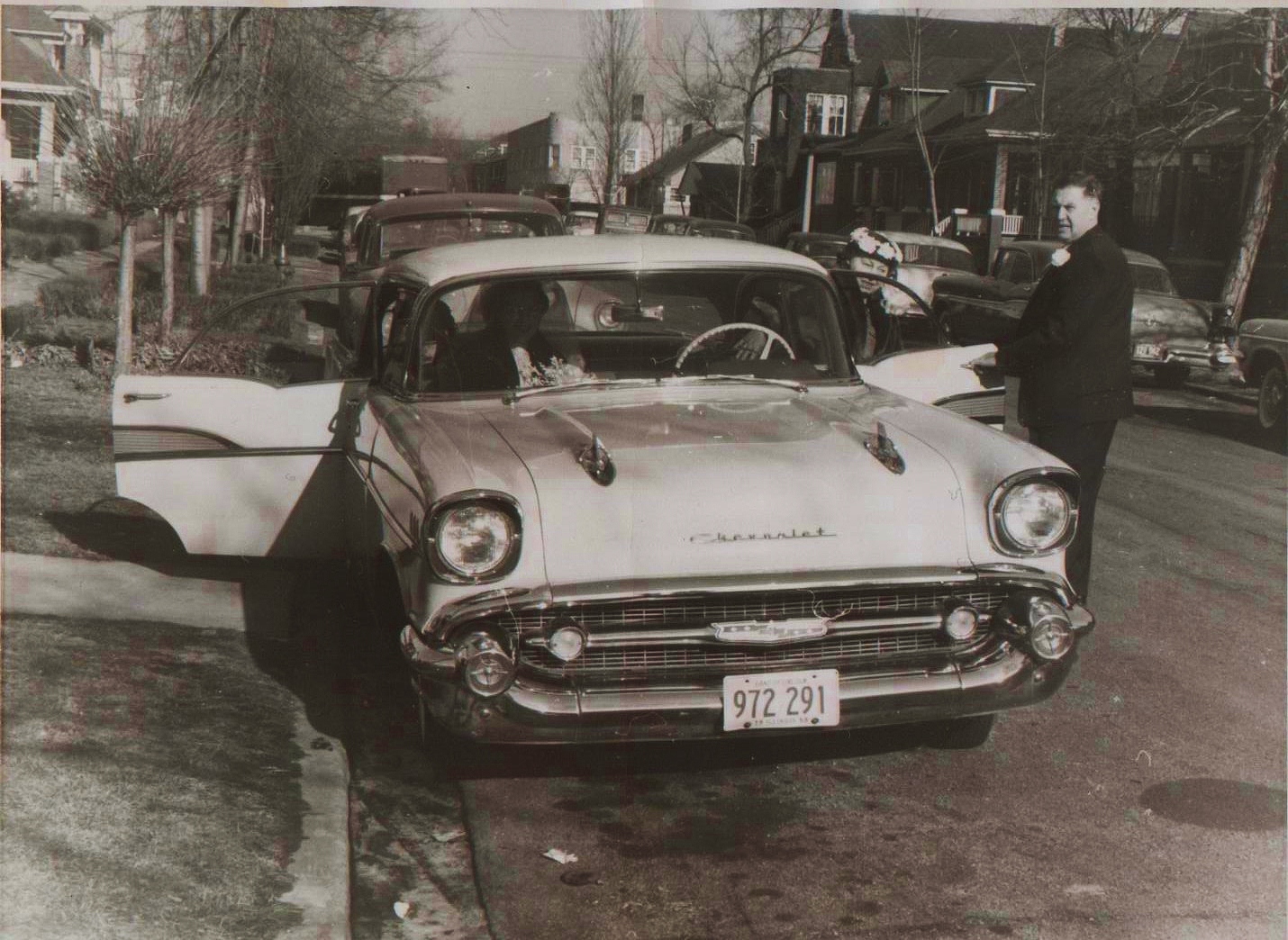 Marquette Park, Chicago, Illinois, January 1958. Mr. Irene's maternal Grandfather, Stanley, holds the back-seat door for his wife, Mr. Irene's maternal Grandmother, Anna.